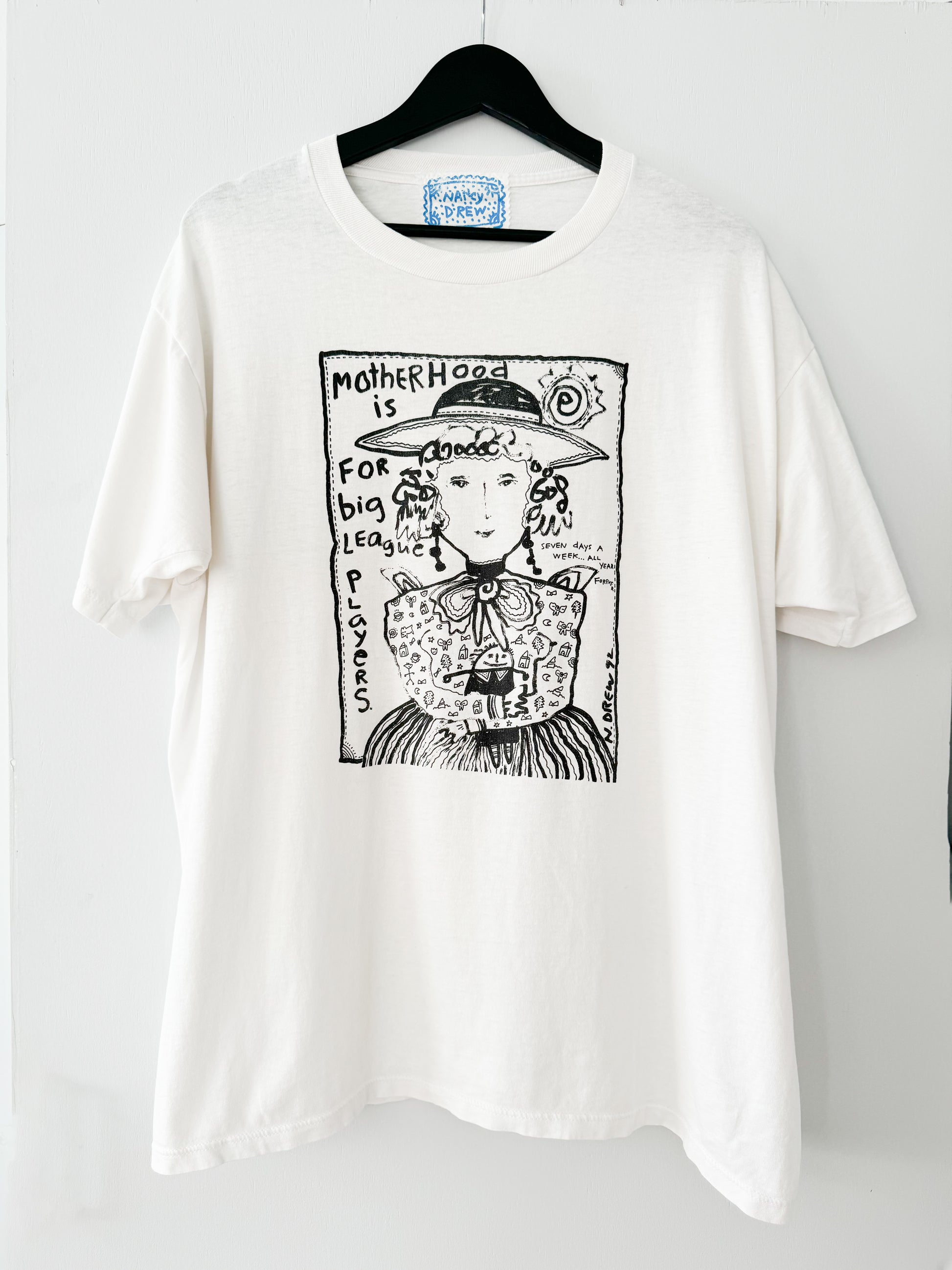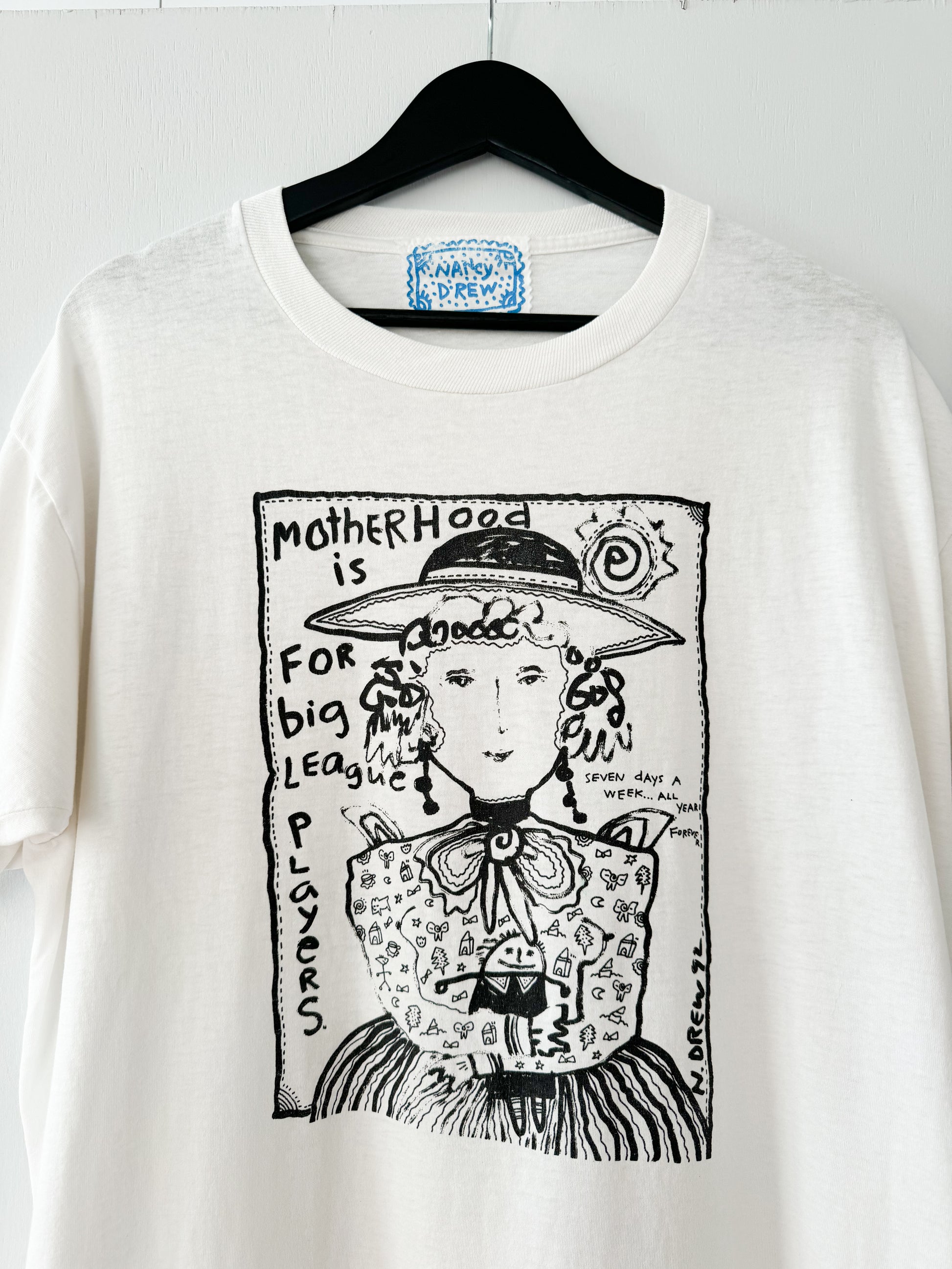 Vintage 1990s Nancy Drew “Motherhood is For Big League Players” Tee , White with Black Print , made in usa