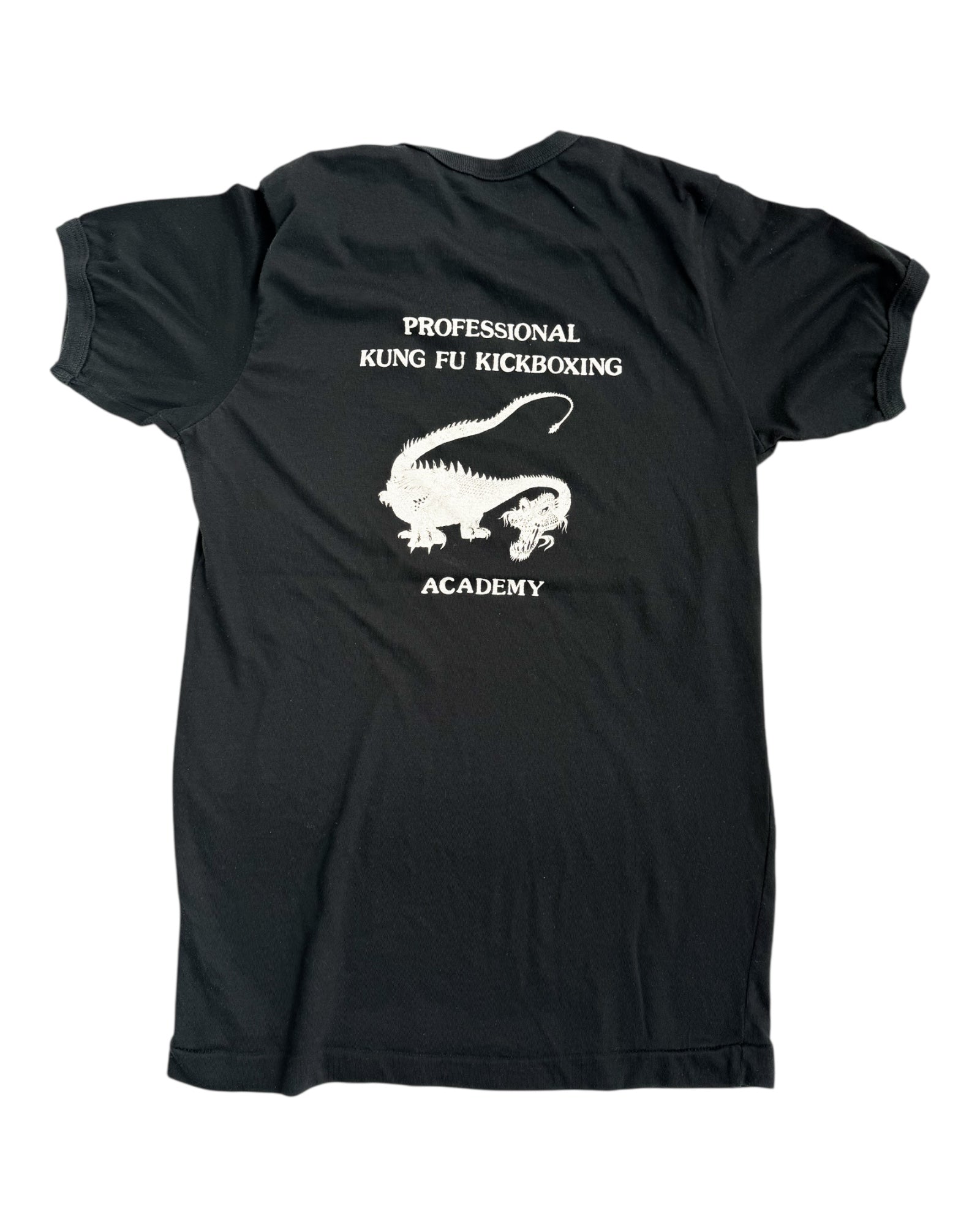 Vintage 1980s Professional Kung Fu Kickboxing Academy Tee , Black with White Print (Front & Back) , (Size : Shoulder 16” /Chest 18” /Length 25”)