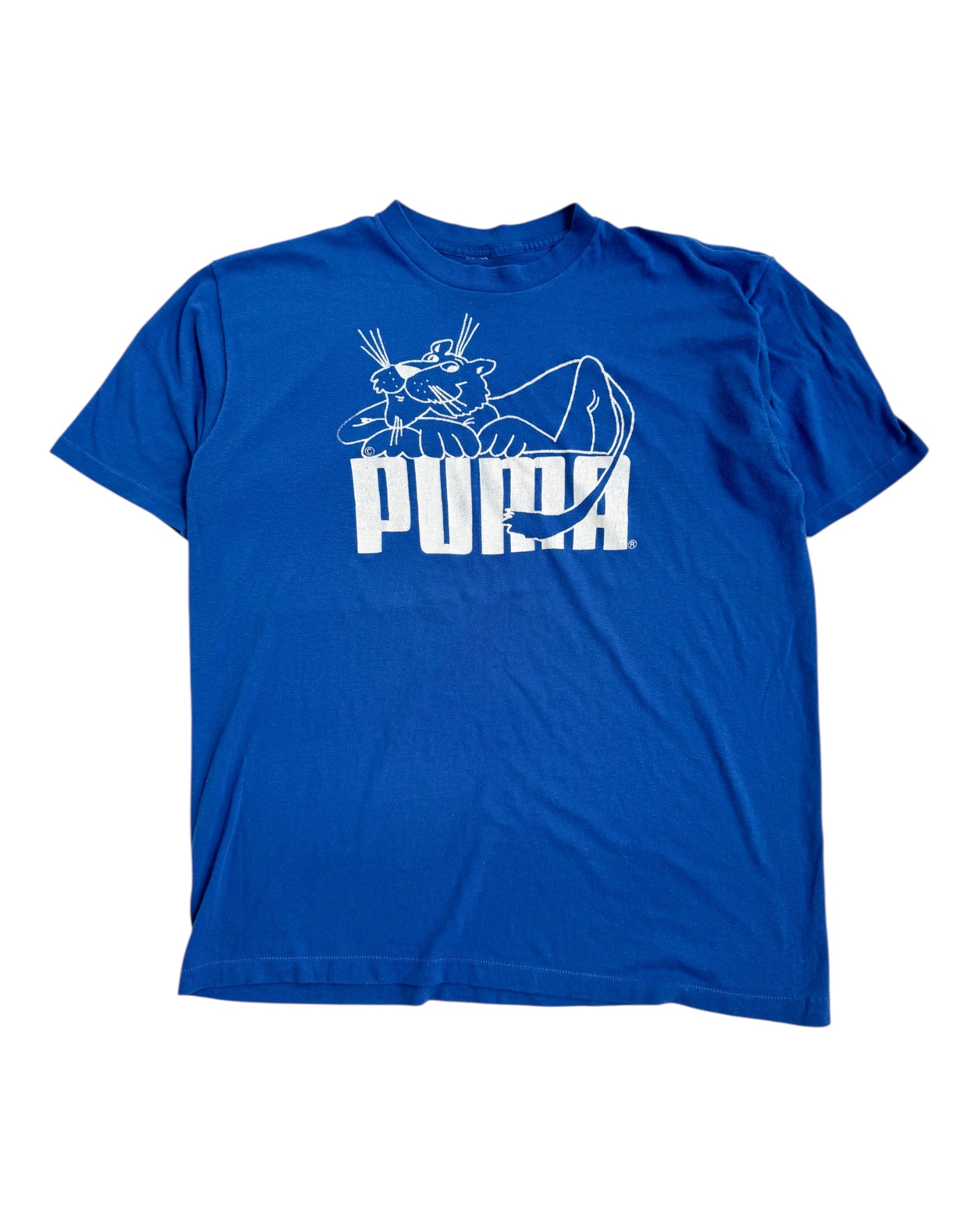 Vintage 1980s Puma Tee , Blue with White Print , made in usa (Size : Shoulder 19” /Chest 21” /Length 28”)