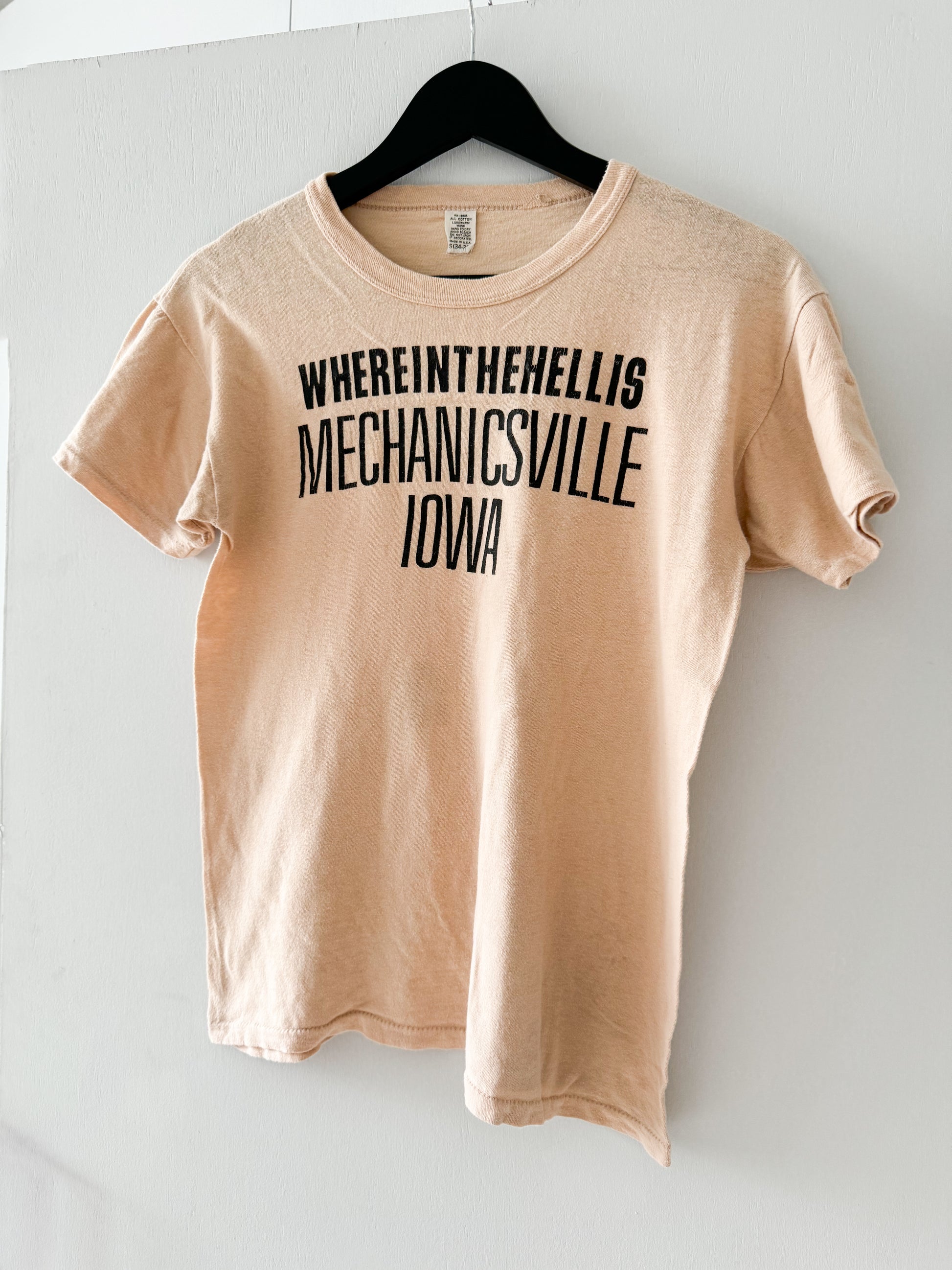 Vintage 1970s Mechanicsville Iowa Tee , Faded Peach with Black Print , made in usa