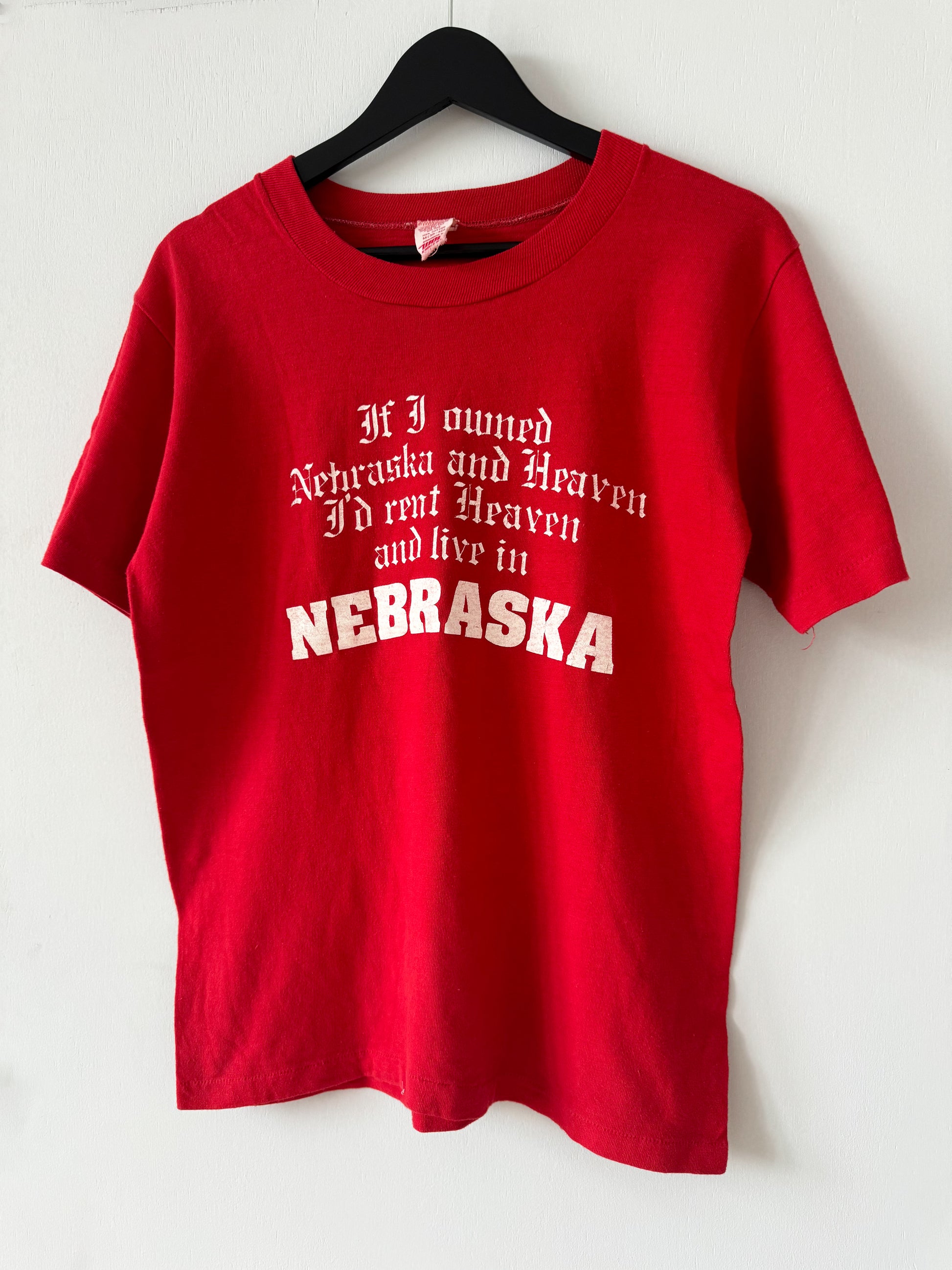 Vintage 1980s Nebraska Tee , Red with White Print (Size : Shoulder 18” / Chest 20” / Length 26”)
