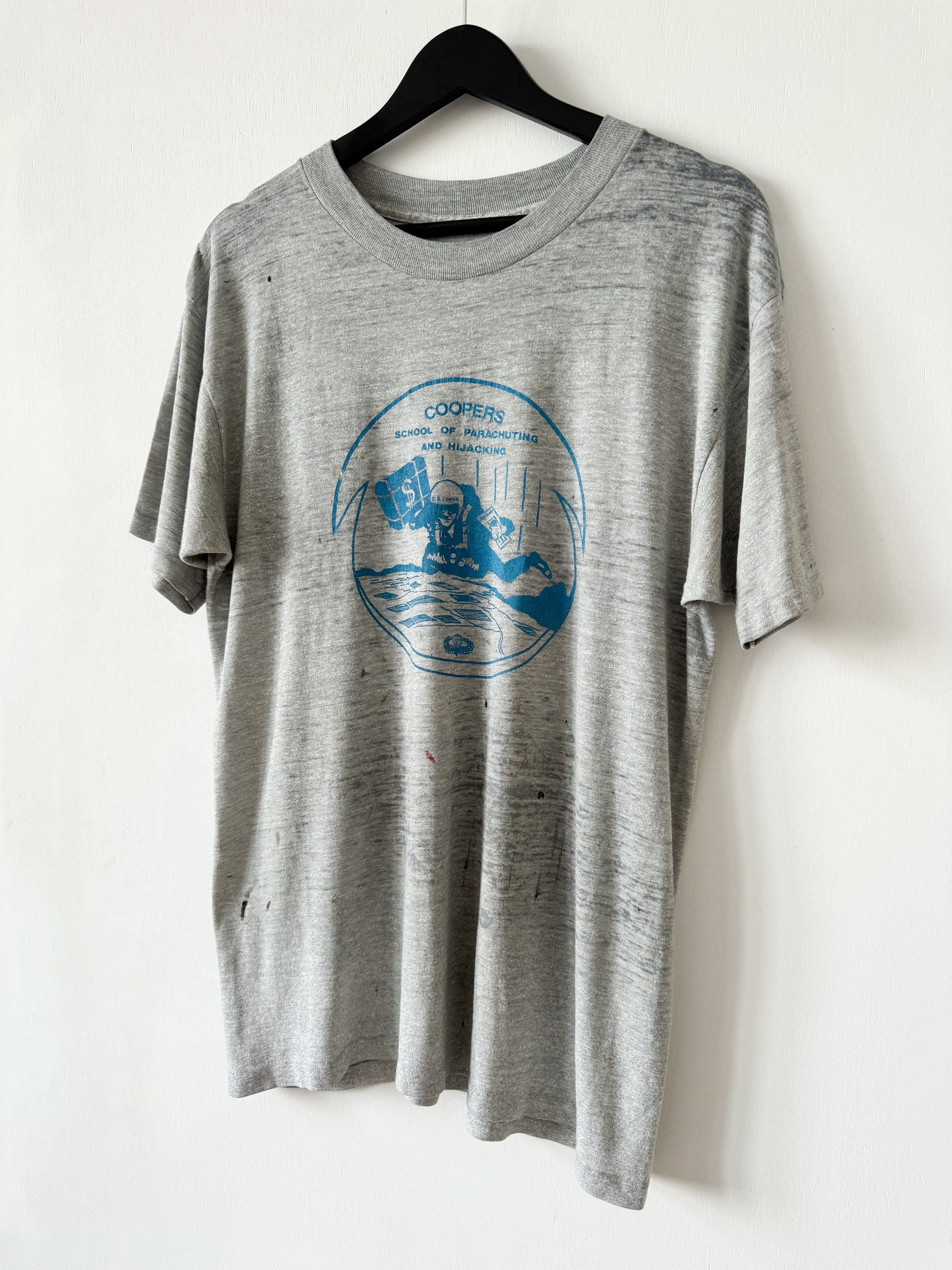 Vintage 1980s Coopers School of Parachuting Tee , Heather Grey with Blue Print (Size : Shoulder 21” / Chest 22” / Length 28”)